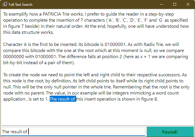 Tarvalas and some very long conversations with Google Gemini to get me through slam-face-on-keyboard debugging sessions. Suffix trees (and tries in general) have fascinated me since the moment I learned they exist (thanks to edX). Since 2020 I’ve wanted to answer the question, “But how would I implement one of those?” Every time I tried I just couldn’t wrap my head around them. I wasn’t understanding that the secret sauce was in Ukkonen’s algorithm, not the tree itself. Proposed in 1995, it’s hard to believe I was alive when it was invented. After a long battle with understanding this algorithm, here’s the code in a little C# program I made for searching for a substring in a text box.
